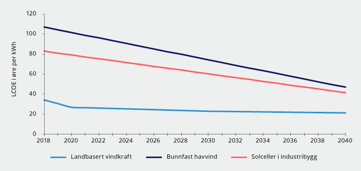 Figur 3.16 viser LCOE og anslått utvikling for vindkraft på land, bunnfast havvind og solkraft på næringsbygg i perioden 2018–2040. LCOE for vannkraft er tatt ut, og fremgår av figur 3.17, siden det er større variasjoner i kostnadsnivået mellom vannkraftverkene.