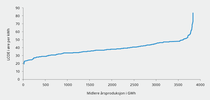 Figur 3.17 viser anslag på LCOE for vannkraft som har fått endelig konsesjon, men som ikke er bygd ut. Da det er få nye store vannkraftprosjekter, inkluderer tallene både små og store vannkraftprosjekter. Midlere årsproduksjon fra disse er om lag 4 TWh, mens det samlede tekniske-økonomiske potensialet er større, jf. punkt 3.2.2. Vannkraft er en moden teknologi, der NVE ikke forventer fallende kostnadsnivå. Samtidig er mye av vannkraften allerede bygd og mange av de beste vannfallene er allerede utnyttet. Enkelte prosjekter har relativt lave utbyggingskostnader, mens de mest kostbare vannkraftprosjektene ikke vil være konkurransedyktige.