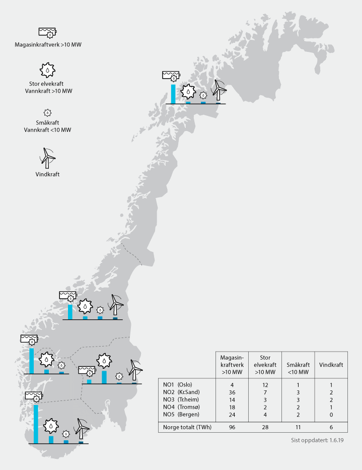 I følge NVEs databaser for vann-, vind- og termiske kraftverk, finnes det over 1600 vannkraftverk, 37 vindparker og 33 termiske kraftverk i Norge. Disse er spredd utover hele landet, og figur 3.2 illustrerer kraftproduksjonen i de fem norske prisområdene. En stor del av magasinkapasiteten er i Sør-Norge, på Vestlandet, samt i Nordland. Det meste av stor elvekraft finnes i Sørøst-Norge. Vindkraftverkene ligger hovedsakelig langs kysten fra Sør-Vestlandet og nordover, men også noe i innlandet.