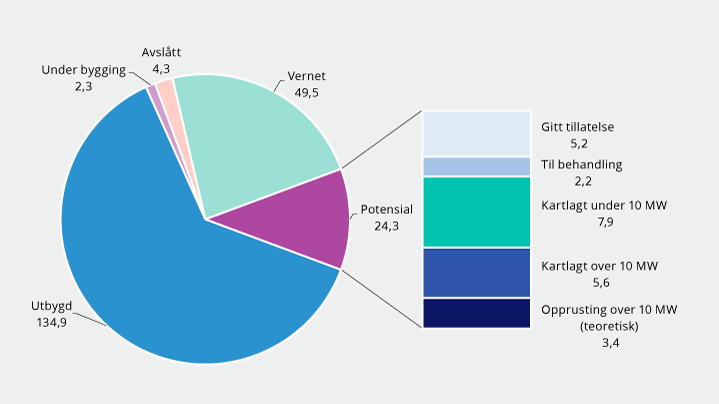Det samlede teknisk-økonomiske potensial for vannkraft i Norge er illustrert i figur 3.3. Av det samlede potensialet på 215 TWh, anslått for nedbørsperioden 1981–2010. Av dette er 134,9 TWh allerede bygd ut. 49,5 TWh er vernet fra utbygging gjennom Samlet plan for vassdrag. Av gjenstående potensial på 24,3 TWh er 5,6 TWh knyttet til stor vannkraft over 10 MW, men mindre enn halvparten av dette er regulerbar produksjon. 7,9 TWh knytter seg til småkraftverk under 10 MW.