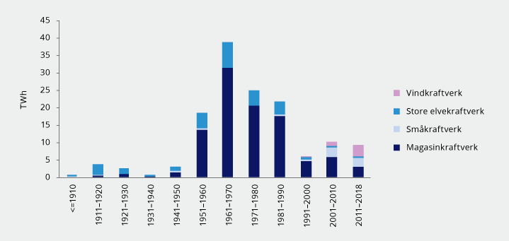 Utbygging av norsk kraftproduksjon startet for over 100 år siden. De fleste store vannkraftverkene ble bygd i perioden 1950–1990, jf. figur 3.4. Etter dereguleringen av kraftmarkedet i 1991 har ny produksjon i stor grad vært småkraft og vindkraft. Noe stor vannkraft har også kommet til i senere tid, men etter 1990 er det er i stor grad eldre kraftverk som har gjennomført omfattende utvidelser.