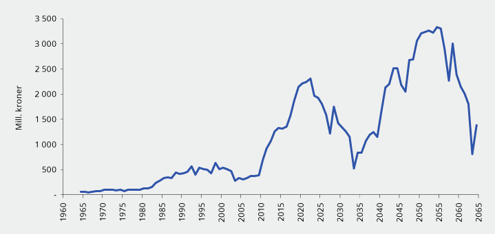 Det er med andre ord et kontinuerlig behov for reinvesteringer i vannkraften. De kommende årene er fornyelsesbehovet særlig stort for elektrisk og mekanisk utstyr. Behovet for reinvesteringer vil heller ikke forsvinne ved slutten av denne investeringssyklusen. En ny stor bølge av reinvesteringer vil bli nødvendig fra 2040 og utover, jf. figur 3.5. Figur 3.5 Modellert 5-årig gjennomsnitt for reinvesteringsbehov i Statkrafts nordiske vannkraftportefølje basert på forventet levetid. 2016-kroner Kilde: Statkraft .