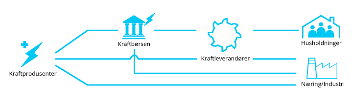 Kraftmarkedet er viktig for balansen mellom forbruk og produksjon av kraft. Nord Pool er kraftbørsen for fysisk krafthandel for de nordiske og baltiske landene. Der handler kraftprodusenter, kraftleverandører, meglere og store forbrukere. Strømleverandørene har deretter avtaler om salg av strøm til sluttforbrukere i næring, industri og husholdninger, jf. figur 3.6.