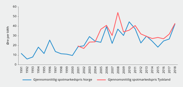 Figur 3.8 Gjennomsnittlig spotmarkedspris på kraft i Norge og Tyskland, 1991–2018. Løpende priser