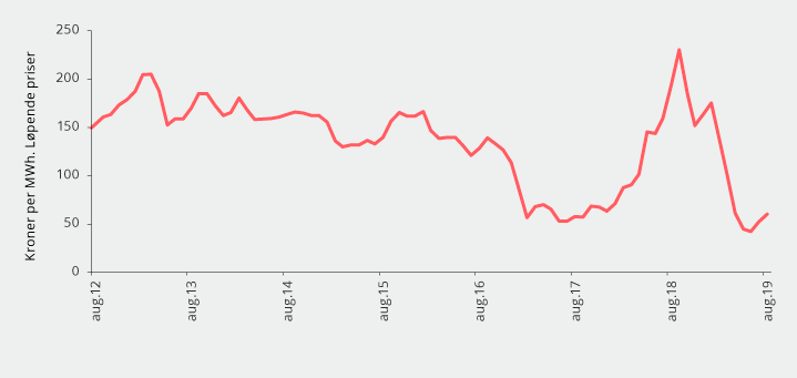 De nordiske kraftprisene i 2019 har på grunn av høy CO2-pris og hydrologisk underskudd i gjennomsnitt vært om lag 40 øre per kWh. Terminprisene for resten av 2019 tilsier at kraftprisen i snitt vil fortsette å ligge på rundt 37 øre per kWh ut året. Mot 2020 og 2021 viser terminprisene at kraftprisnivået beveger seg til om lag 33 øre per KWh.