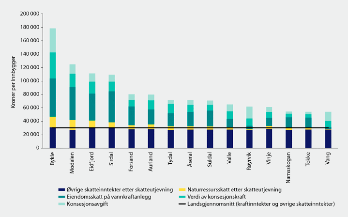Figur 4.10 viser de 15 kommunene som har de høyeste kraftinntektene og skatteinntekter per innbygger etter skatteutjevning. Disse kommunene har inntekter per innbygger på mellom 590 og 180 pst. av landsgjennomsnittet. Kommunene har 0,4 pst. av innbyggerne i Norge og fikk samtidig omlag 23 pst. av de samlede kommunale kraftinntektene i 2017.