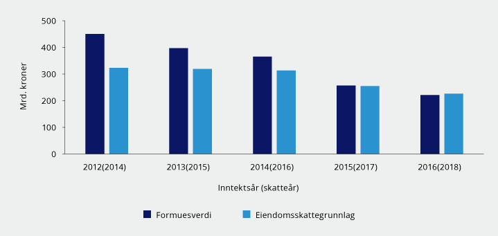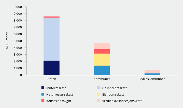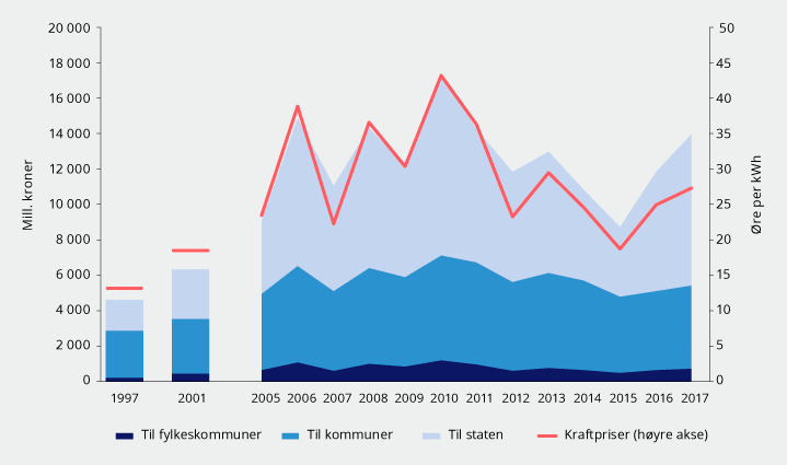 Figuren inkluderer konsesjonsavgift og verdien av konsesjonskraft. Formuesskatten er ikke med i figuren på grunn av endringer i sats og fordeling mellom stat og kommuner i perioden.