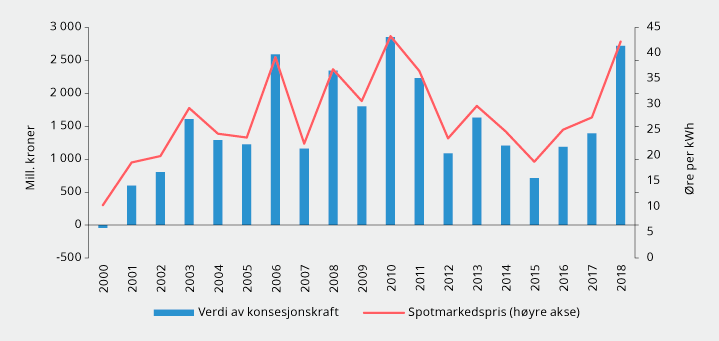 Figur 4.3 Anslått verdi av konsesjonskraft. 2000–2018. Løpende priser