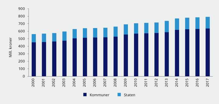 I 2017 mottok 268 kommuner og staten konsesjonsavgifter. Til sammen utgjorde dette 837 mill. kroner. Utviklingen i konsesjonsavgiftene betalt til stat og kommune har ligget relativt stabilt over tid, jf. figur 4.3.