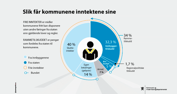 For å forstå hvilken virkning skatteinntektene fra kraftforetak har for kommuner og fylkeskommuner beskrives kommunenes inntektssystem i dette punktet. Inntektssystemet skal bidra til at kommuner og fylkeskommuner kan gi et likeverdig tjenestetilbud til innbyggerne. Frie inntekter er midler kommuner og fylkeskommuner kan disponere fritt uten andre føringer fra staten enn gjeldende lover og regler. Inntektssystemet fordeler disse inntektene til kommuner og fylkeskommuner. De frie inntektene består av rammetilskudd og skatteinntekter, og er for kommuner og fylkeskommuner samlet anslått til om lag 357 mrd. kroner i 2017. Av de frie inntektene kommer 45 pst. som rammetilskudd og 55 pst. fra skatteinntekter. Sammen med merverdiavgiftskompensasjon utgjør dette nærmere 80 pst. av de samlede inntektene til kommunesektoren.