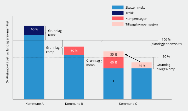 En betydelig andel av kommunesektorens inntekter kommer gjennom skatteinntekter fra innbyggerne. Det er store forskjeller i skatteinntektene mellom kommunene. Gjennom en egen skatteutjevning omfordeles deler av disse forskjellene mellom kommunene. Skatteinntektene blir omfordelt fra kommuner med skatteinntekter over landsgjennomsnittet til kommuner med skatteinntekter under landsgjennomsnittet. Naturressursskatten for vannkraft inngår i skatteutjevningen for kommuner og fylkeskommuner. I tillegg inngår inntekts- og formuesskatt for personlige skattytere (formuesskatt går kun til kommuner). Fylkeskommuner med skatteinntekter under landsgjennomsnittet blir kompensert for 87,5 pst. av differansen mellom egen skatteinngang og gjennomsnittet i landet. Fylkeskommuner med skatteinngang over landsgjennomsnittet blir trukket for 87,5 pst. av differansen mellom egen skatteinngang og landsgjennomsnittet. For kommunene er skatteutjevningen 60 pst., men i tillegg blir kommuner med skatteinntekter under 90 pst. av landsgjennomsnittet kompensert for 35 pst. av differansen mellom egne skatteinntekter og 90 pst. av landsgjennomsnittet. Denne tilleggskompensasjonen til kommunene finansieres ved at hver kommune trekkes med et likt beløp per innbygger, jf. figur 4.8. Siden skatteutjevningen ikke er fullstendig, kan en kommune eller fylkeskommune med høye inntekter beholde vesentlige deler av merinntektene, for eksempel fra naturressursskatten.