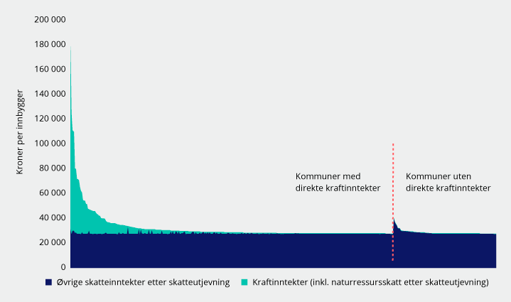 Figur 4.9 viser kraftinntekter og øvrige skatteinntekter etter skatteutjevning i kroner per innbygger for hver enkelt kommune i 2017. I gjennomsnitt per innbygger i hele landet utgjør disse inntektene i overkant av 30 400 kroner. I figuren er kommunene rangert fra høyest til lavest inntekter per innbygger, men fordelt slik at kommuner som mottar direkte kraftinntekter er plassert til venstre i figuren, og kommuner uten direkte kraftinntekter er plassert til høyre i figuren.