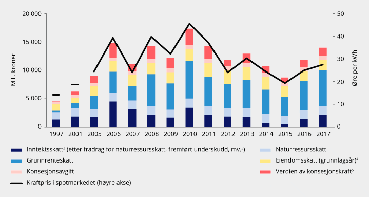 Hovedprinsippene bak skatteordningene har ligget fast siden kraftskattereformen i 1997. Figur 7.1 viser utviklingen i inntektene fra de ulike ordningene siden 1997. De siste ti årene har inntektene variert mellom om lag 8 og 18 milliarder kroner. Samlet påløpt skatt i næringen var i 2017 om lag 14 milliarder kroner. I 2018 var den gjennomsnittlige kraftprisen 40 øre per kWh sammenlignet med 27 øre per kWh i 2017. Inntektene fra lønnsomhetsbaserte skatter og konsesjonskraft var dermed trolig vesentlig høyere i 2018.