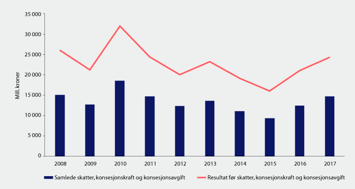 Skatteinntektene bør ses i sammenheng med det samlede økonomiske resultatet fra vannkraftproduksjon før skatteordninger, konsesjonskraft og konsesjonsavgift, som vist i figur 7.2.