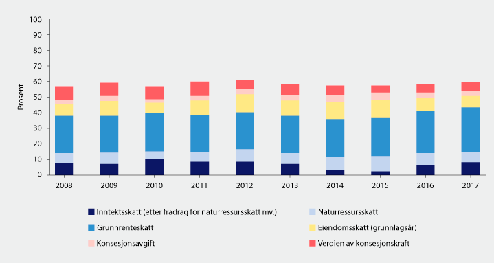 Det offentlige mottar en vesentlig del av resultatet i næringen gjennom skatter, konsesjonskraft og konsesjonsavgift. Figur 7.3 viser inntekter til det offentlige delt på resultatanslaget i figur 7.2. De siste årene har samlede inntekter fra skatter, konsesjonskraft og konsesjonsavgift ligget relativt stabilt, på rundt 60 pst. av resultatet før skatt, konsesjonskraft og konsesjonsavgift.