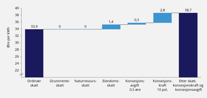 Grunnrenteskatten virker nøytralt på selskapenes investeringsbeslutninger og endrer dermed ikke balanseprisen. Naturressursskatten er en omfordeling av inntekter fra staten til kommuner/fylkeskommuner som normalt ikke påvirker selskapenes lønnsomhet, jf. punkt 11.1. Dagens eiendomsskatt for vannkraft, konsesjonskraft og konsesjonsavgift virker derimot som bruttoavgifter som medfører en tilleggskostnad for selskapene. Dette øker balanseprisen etter skatt. Virkningene er størst for eiendomsskatt og konsesjonskraft. Samlet vil balanseprisen for selskapene øke fra 33,9 til 38,7 øre per kWh. Investeringer som kan være lønnsomme for samfunnet ved en forventet kraftpris på for eksempel 35 øre per kWh vil dermed være klart ulønnsomme for selskapene.