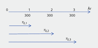 Vi ser først på et tilfelle der staten tilbyr en fast rente. Det er nærliggende å sammenligne eksemplet over med et tilfelle der investor alternativt plasserer tilsvarende beløp i statspapirer med samme løpetider. Vi antar først at det er fullt samsvar mellom statsrentens løpetid og tilbakebetalingen av lån. Anta at r0,t betegner renten på en plassering på tidspunkt 0 i et rentepapir med løpetid t, og at staten tilbyr rentepapirer til enhver tid med løpetider på henholdsvis 1, 2 og 3 år. Figur 8.2 illustrerer rentene som oppnås ved å plassere penger i rentepapirer med ulike løpetider.
