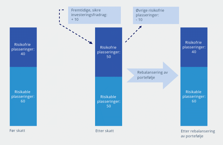 Vi ser så på hvordan investeringsporteføljen endres når det innføres en grunnrenteskatt. Investeringsfradragene i grunnrenteskatten utgjør en sikker plassering. I figuren er dette illustrert ved at investorens andel av risikofrie plasseringer øker med 10 prosentenheter og utgjør 50 pst. av porteføljen i den midterste søylen i figuren. Ettersom dette er en høyere andel enn investors risikopreferanse, kan investor rebalansere porteføljen ved å selge en tilsvarende andel av sine øvrige risikofrie plasseringer. Søylen til høyre viser porteføljen etter rebalansering, som er identisk med den opprinnelige porteføljen og i tråd med investors risikopreferanse.