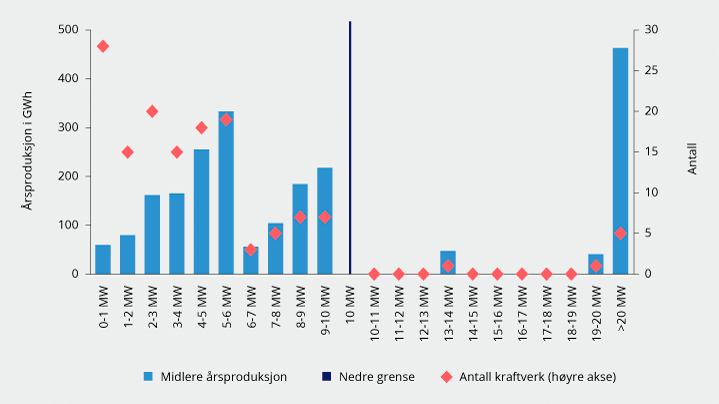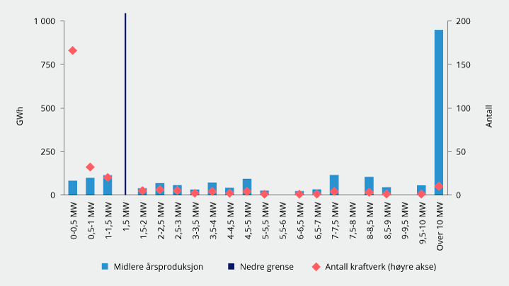 Anslaget i tabell 8.5 er statisk og tar ikke hensyn til produksjonstapet og kostnadsøkninger som følge av tilpasninger til nedre grense. Selskapene vil ha insentiver til nedskalering opp mot det dobbelte av nedre grense, jf. punkt 8.5.3. Ved dagens nedre grense på 10 000 kVA vil selskapene ha insentiv til å nedskalere anlegg opp mot 20 000 kVA. Derimot ville en ved en nedre grense på 1 500 kVA bare ha insentiv til å tilpasse kraftverk opp mot 3 000 kVA. Den dynamiske effekten kan illustreres ved søknader om nedjustering i eksisterende kraftverk. Siden 2014, da forslaget om nedre grense på 10 MVA ble lagt frem, har NVE mottatt søknader om å nedjustere ytelsen i eksisterende kraftverk tilsvarende et midlere årlig produksjonstap på om lag 285 GWh. Samtidig er det søkt om økt ytelse i kraftverk som var under den tidligere nedre grensen på 5,5 MVA. Merproduksjonen som følge av dette utgjør om lag 25 GWh.