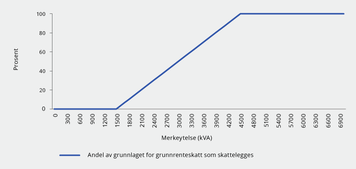Med en slik gradering vil eksempelvis et kraftverk med påstemlet merkeytelse på 3 000 kVA ilegges grunnrenteskatt for 50 pst. av beregnet grunnlag for grunnrenteskatt, som med dagens regelverk ville tilsi en effektiv grunnrenteskattesats på 18,5 pst. Andelen av grunnrenteskattegrunnlaget som vil være gjenstand for grunnrenteskatt i en slik graderingsmodell er illustrert i figur 8.7.
