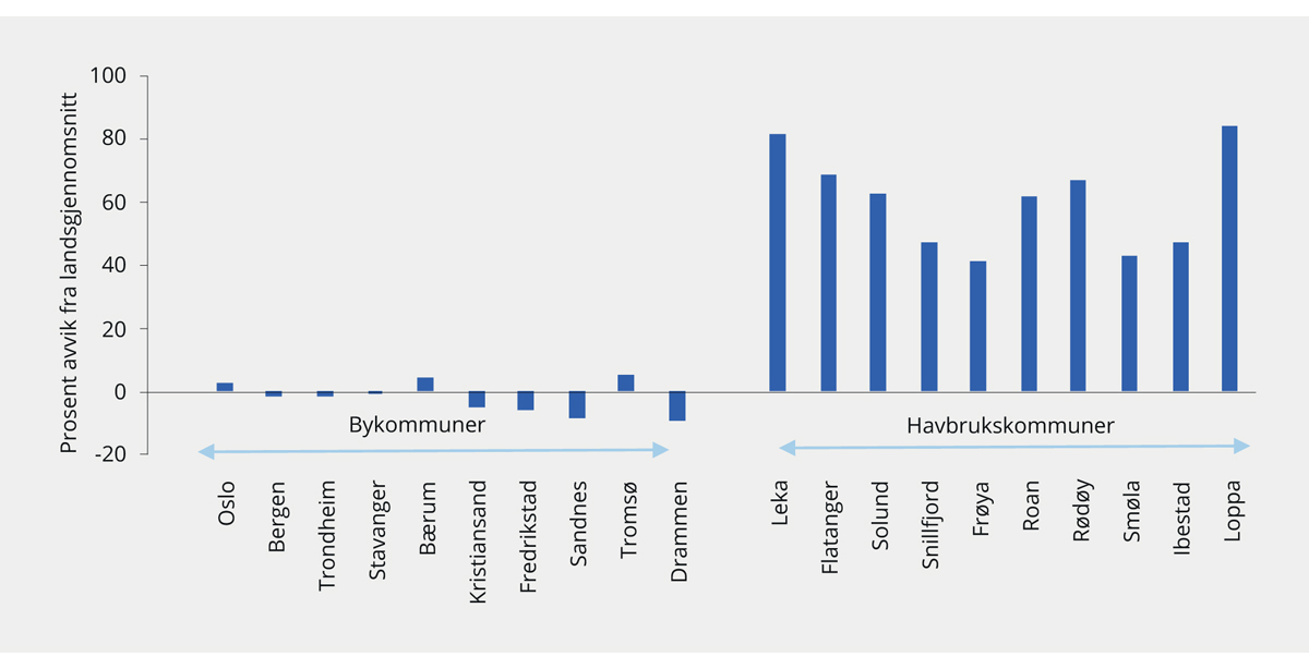 Figur 9.10 Forskjeller i inntekt per innbygger mellom bykommuner og havbrukskommuner. Korrigerte frie inntekter og inntekter fra Havbruksfondet i 2018 som andel av landsgjennomsnittet.1 Prosent