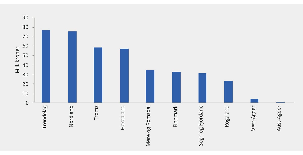 Figur 9.12 Utbetalinger til fylkeskommuner fra Havbruksfondet i 2018. Mill. kroner.