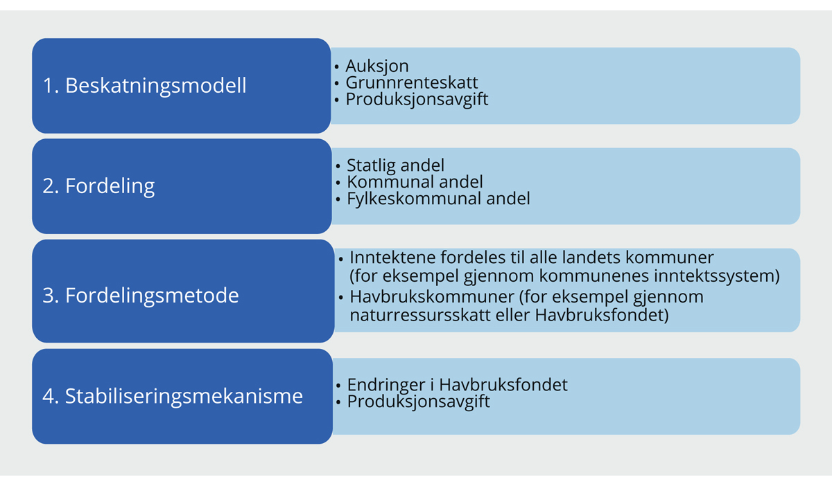 Figur 9.13 gir en skjematisk oversikt over aktuelle valg knyttet til utformingen av skattesystemet for havbruksnæringen og hvordan inntektene kan fordeles mellom stat og kommunal sektor. I steg 1 må en ta stilling til beskatningsmodeller, i steg 2 må en ta stilling til fordeling mellom statlig og kommunal sektor og i steg 3 må en ta stilling til hvilken fordelingsmetode som skal brukes. I steg 4 må en vurdere en stabiliseringsmekanisme, det vil si en mekanisme som har som formål å gjøre de kommunale inntektene fra havbruksnæringen mer stabile og forutsigbare. Kommunal sektor brukes i det videre som en fellesbetegnelse for kommuner og fylkeskommuner. De ulike stegene er nærmere beskrevet nedenfor.