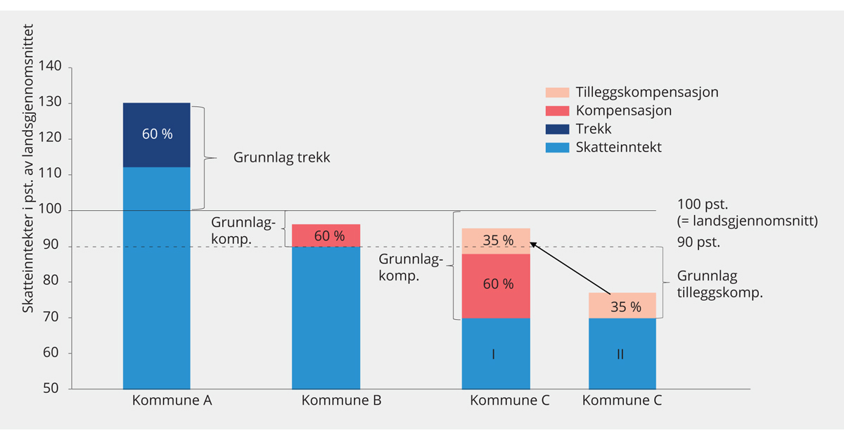 I tillegg blir kommuner med skatteinntekter under 90 pst. av landsgjennomsnittet kompensert for 35 pst. av differansen mellom egne skatteinntekter og 90 pst. av landsgjennomsnittet. Hvis kommune C har en skatteinntekt på 70 kroner og landsgjennomsnittet er 100 kroner, får kommunen først kompensert 60 pst. av differansen mellom 70 og 100 kroner, det vil si 18 kroner. I tillegg blir 35 pst. av differansen mellom 70 og 90 kroner kompensert, det vil si 7 kroner. Samlet sitter da kommune C igjen med 95 kroner i skatteinntekter etter utjevning.