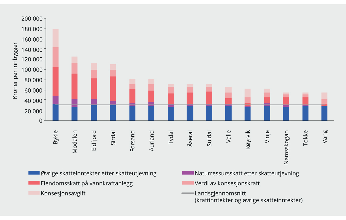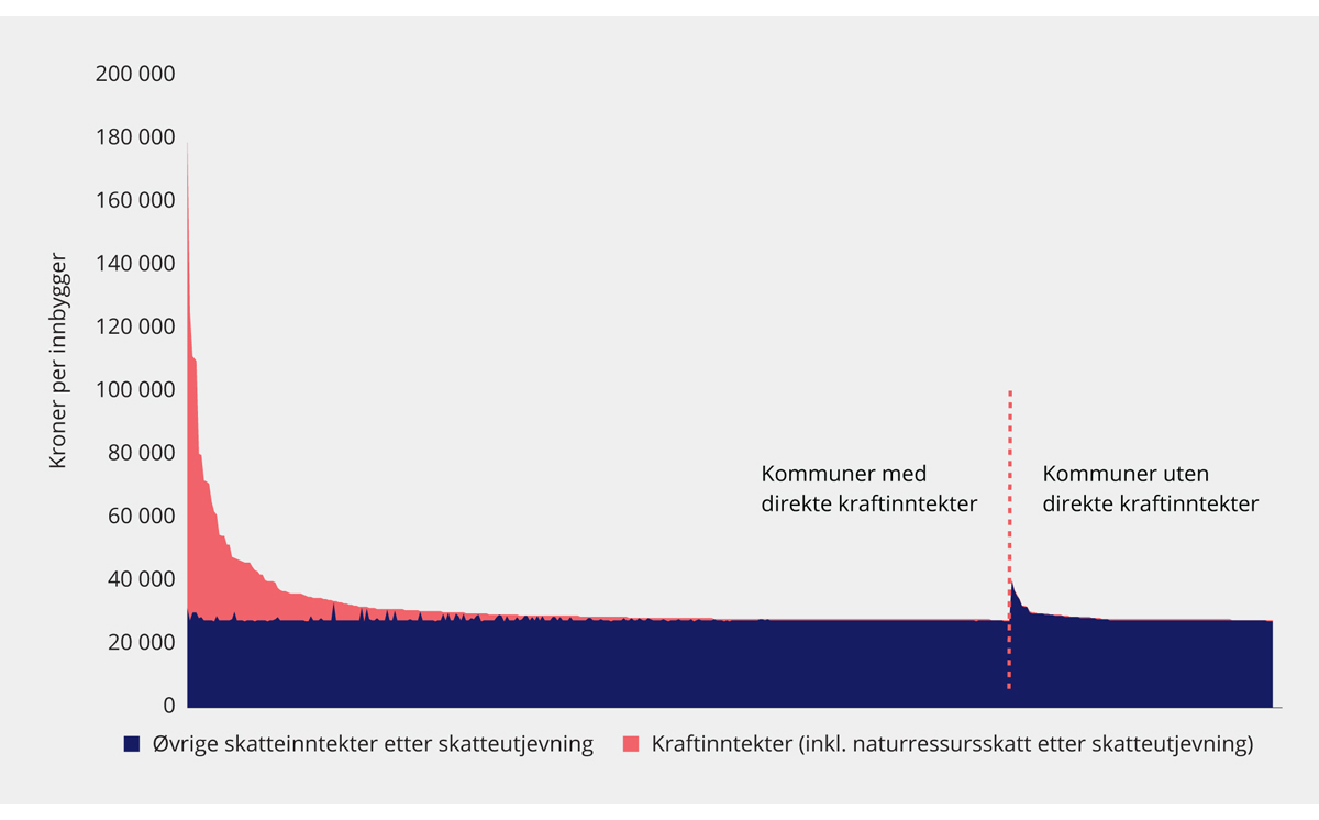 Figur 9.3 viser skatteinntekter etter skatteutjevning og kraftinntekter i kroner per innbygger i hver enkelt kommune for 2017. Kraftinntekter omfatter her kommunenes inntekter fra eiendomsskatt på vannkraftanlegg, konsesjonsavgift, verdien av konsesjonskraft og naturressursskatt. Inntekter fra naturressursskatten inngår i skatteutjevningen. I figuren er naturressursskatten beregnet som netto inntekt etter skatteutjevning, men skilt ut fra de øvrige skatteinntektene i skatteutjevningen. I gjennomsnitt per innbygger i hele landet utgjør disse inntektene i overkant av 30 400 kroner, se NOU 2019: 16 Skattlegging av vannkraftverk. I figuren er kommunene rangert fra høyest til lavest inntekter per innbygger, men fordelt slik at kommuner som mottar direkte kraftinntekter er plassert til venstre i figuren og kommuner uten direkte kraftinntekter er plassert til høyre i figuren. Som det fremgår av figuren er det en liten gruppe kommuner som mottar svært høye inntekter per innbygger.
