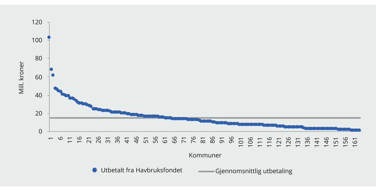 De samlede utbetalingene fra Havbruksfondet til kommunene i 2018 var på om lag 2,4 mrd. kroner, mens fylkeskommunene fikk 0,4 mrd. kroner. Det var i alt 164 kommuner som fikk utbetalinger fra Havbruksfondet i 2018. Figur 9.6 viser hvordan utbetalingene er fordelt mellom kommunene. Gjennomsnittlig utbetaling per kommune var på 14 mill. kroner, men det er store variasjoner mellom kommunene. Kommunen som fikk den største utbetalingen mottok rundt 103 mill. kroner, mens 75 kommuner mottok under 10 mill. kroner.