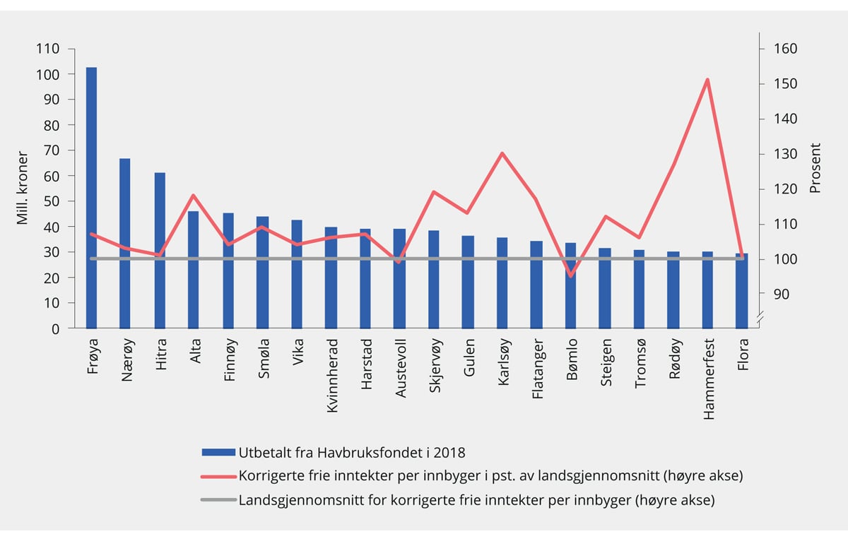 Figur 9.7 viser utbetalingene til de 20 kommunene med høyest utbetaling fra Havbruksfondet i 2018 og korrigerte frie inntekter inkludert eiendomsskatt, konsesjonskraft og -avgift samt fordelen av arbeidsgiveravgift i pst. av landsgjennomsnittet (høyre akse). Dersom kommunen har frie inntekter over 100 pst. har den høyere inntekter enn landsgjennomsnittet.