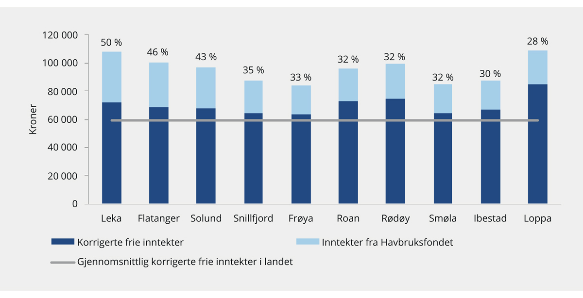 1 Korrigerte frie inntekter tilsvarer korrigerte frie inntekter per innbygger inkludert eiendomsskatt, konsesjonskraft og -avgift og fordel av differensiert arbeidsgiveravgift, se Prop. 113 S (2018–2019) Kommuneproposisjonen 2020. I tillegg er det tatt hensyn til utbetalinger fra Havbruksfondet.