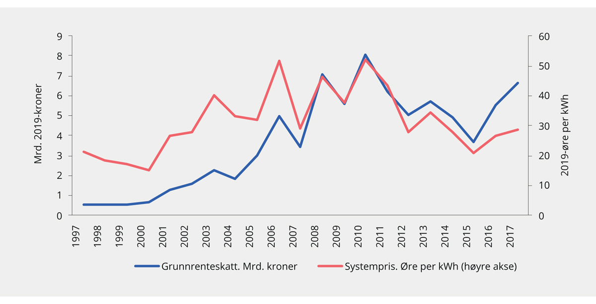 Figur 10.1 Inntekter fra grunnrenteskatt fra vannkraft og systempris på kraft. 2019-kroner