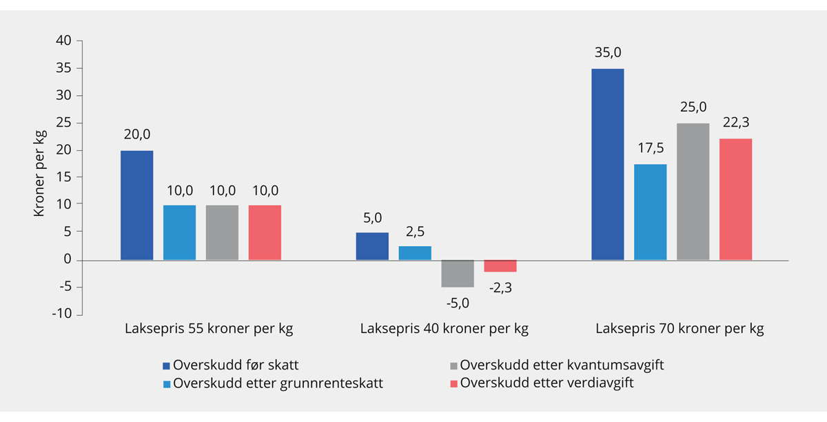 Lønnsomheten i næringen kan også påvirkes av endringer i markeds- og konkurranseforhold. Dersom skjerpet internasjonal konkurranse fører til at prisene på laks faller, som illustrert i eksempelet i boks 10.1, vil det føre til lavere skattebetalinger idet inntektssiden i skattegrunnlaget blir redusert. En overskuddsbasert grunnrenteskatt vil også ta hensyn til endrede fôrkostnader over tid, for eksempel som følge av økte råvarepriser, eller dersom settefiskproduksjon skulle bli strengere regulert og gi økte priser på smolt.