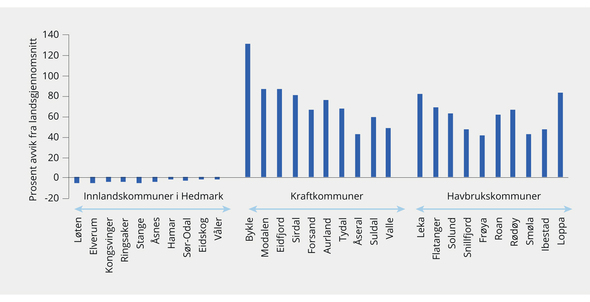 Flertallet vil peke på at dagens ordning med Havbruksfondet bidrar til å øke forskjellene mellom havbrukskommuner og andre kommuner, og forsterker forskjellen på tvers av kommunene i Norge. Forskjeller i inntekter mellom kraft- og havbrukskommuner og andre kommuner fremkommer tydelig av figur 10.3 som måler avviket fra landsgjennomsnittet av korrigerte, frie inntekter. Mens innlandskommuner i Hedmark generelt ligger under landsgjennomsnittet, får enkelte kraft- og havbrukskommuner korrigerte, frie inntekter som er over 50 pst. høyere enn landsgjennomsnittet.