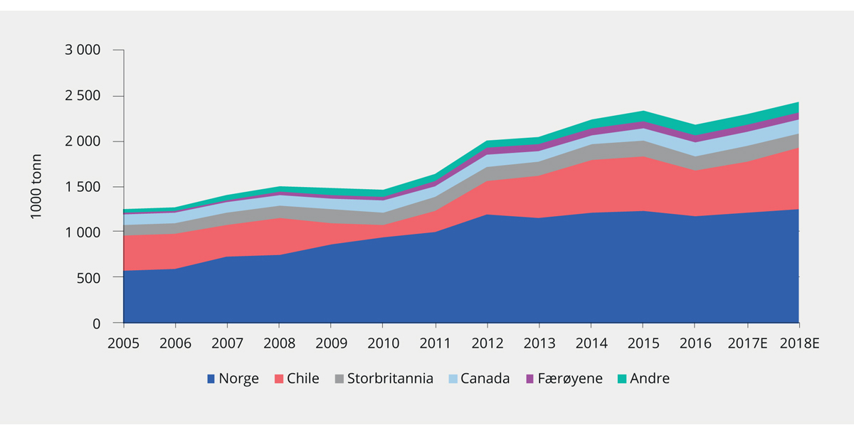 Laks er en global handelsvare. Norge er det landet i verden hvor det produseres mest oppdrettet laksefisk, og hele 95 pst. av norsk lakseproduksjon blir eksportert. Med dagens åpne merdbaserte teknologi er det kun et begrenset antall steder i verden hvor de naturgitte forholdene muliggjør effektiv produksjon av laks i sjø. I tillegg til Norge er Chile, Storbritannia, Canada og Færøyene de landene hvor det produseres mest oppdrettet laksefisk. Figur 4.1 viser utviklingen i den samlede globale produksjonen av oppdrettet atlantisk laks og utviklingen i produksjonen i disse landene fra 2005 til 2018.