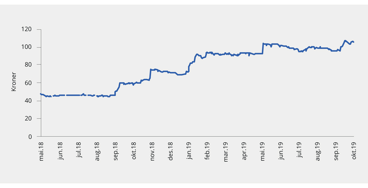 Figur 4.11 Atlantic Sapphires aksjekursutvikling. Mai 2018–oktober 2019. Kroner