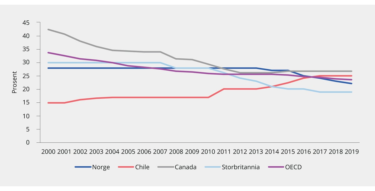 Selskapsskattesatsen i Norge lå uendret på 28 pst. i perioden 1992–2013. Satsen ble redusert til 27 pst. i 2014, deretter til 25 pst. i 2016, 24 pst. i 2017, 23 pst. i 2018 og videre til 22 pst. i 2019. En selskapsskattesats på 22 pst. er om lag på linje med gjennomsnittet i OECD. Den er noe høyere enn selskapsskattesatsen i Storbritannia, men ligger under selskapsskattesatsen i Chile. Den ligger også under den canadiske selskapsskattesatsen når man tar hensyn til både den føderale selskapsskatten og selskapsskatten til provinsene og territoriene. Figur 4.12 viser formelle selskapsskattesatser i utvalgte konkurrentland i perioden 2000 til 2019.