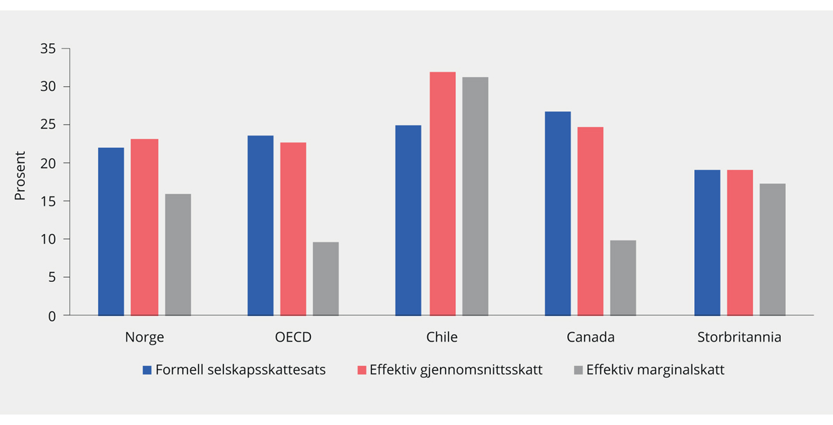 De effektive skattesatsene har blitt redusert de siste årene som følge av reduserte formelle selskapsskattesatser. Effektiv gjennomsnittlig skattesats i Norge er på nivå med gjennomsnittet i OECD, mens den effektive marginale skattesatsen er noe høyere i Norge. Sammenlignet med våre konkurrentland er den effektive gjennomsnittsskatten lavere enn i Chile og Canada, men noe over Storbritannia. Den effektive marginale skattesatsen ligger under Chile og Storbritannia, men over Canada.