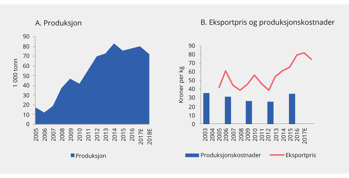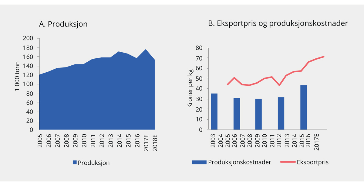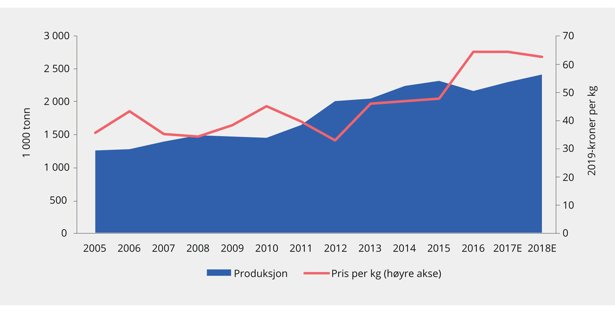 Det har i flere år vært en betydelig økning i produksjonen av og etterspørselen etter oppdrettslaks. Siden 2005 har den globale produksjonen av oppdrettslaks økt fra om lag 1 252 000 tonn til 2 418 000 tonn i 2018 (estimert), en økning på i overkant av 90 pst. Samtidig har prisen på oppdrettslaks, målt i 2019-kroner, økt fra 35 kroner per kg til om lag 63 kroner per kg, se figur 4.6. Målt i euro har realprisen økt fra om lag 4 euro per kg til om lag 6 euro per kg i samme periode, eller om lag 50 pst.