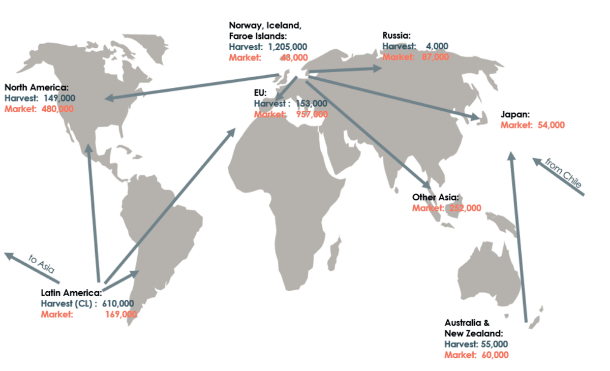 Figur 4.8 Global varestrøm av oppdrettslaks i 2018. Produksjon i tonn