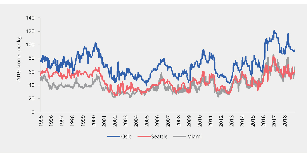 1 Data fra Oslo er basert på en gjennomsnittspris for omsetning av flere størrelser fisk, data fra Seattle er omsetning av fersk, hel laks mellom om lag 4 og 5 kg og data fra Miami er omsetning av ferske fileter mellom om lag 1,5 og 2 kg.