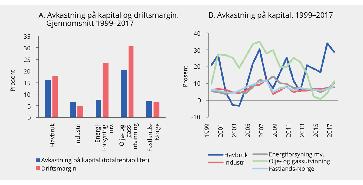 Et lønnsomhetsmål er totalrentabilitet som måler gjennomsnittlig avkastning på kapitalen i virksomheten før skatt. I havbruksnæringen var totalrentabiliteten på 15,9 pst. målt som gjennomsnitt over perioden 1999 til 2017, mens den for industrien i samme periode var på 6,6 pst. Et annet lønnsomhetsmål er driftsmargin som måler driftsresultatet i forhold til driftsinntekt. Gjennomsnittlig driftsmargin i havbruksnæringen var i den samme perioden på 18,0 pst., mens den for industrien var på 4,8 pst. Begge disse målene viser at lønnsomheten i havbruksnæringen har vært svært høy sammenlignet med industrien1, se også figur 6.1 A.