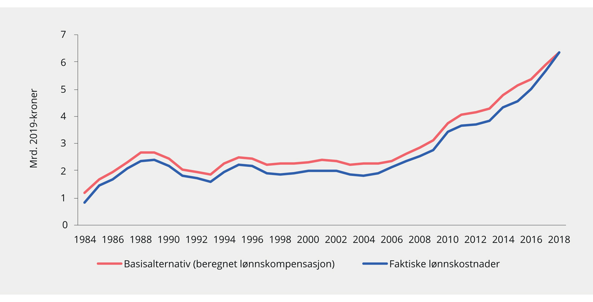 Figur 6.10 viser lønnskostnadene i akvakultur beregnet på to ulike måter. Den første måten å beregne kostnadene på er timelønnssatsen for Fastlands-Norge multiplisert med totale timeverk for både lønnstakere og selvstendige i næringen, slik det er gjort i basisalternativet. Den andre tilnærmingen er å bruke faktiske lønnskostnader slik de fremkommer i nasjonalregnskapet, og i tillegg bare ta med lønnstakernes lønn. Som figuren viser er det relativt små forskjeller mellom de to måtene å beregne lønnskostnadene på. Med faktiske lønnskostnader blir grunnrenten i akvakultur noe høyere enn i basisalternativet.