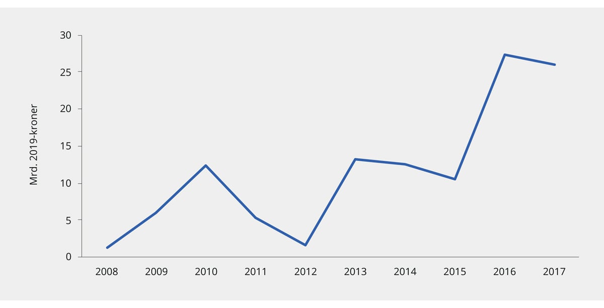 Figur 6.7 viser anslått grunnrente i havbruksnæringen hentet fra Greaker og Lindholt (2019). Fra begynnelsen av 2000-tallet har grunnrenten innen havbruk vist en stigende trend, men har samtidig vært gjenstand for betydelige svingninger frem til 2012. Fra 2012 har grunnrenten steget markant, og de tre siste årene har den vært på over 20 mrd. kroner.