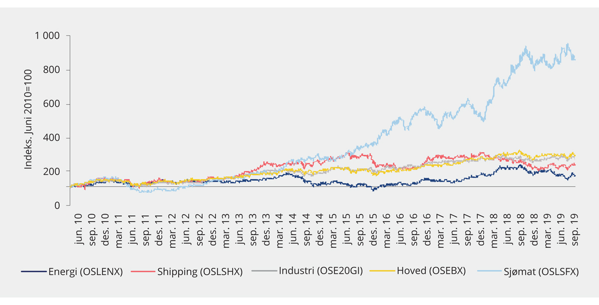 Figur 6.2 Aksjekursutvikling for utvalgte indekser på Oslo Børs. Juni 2010–oktober 2019. Indeksert