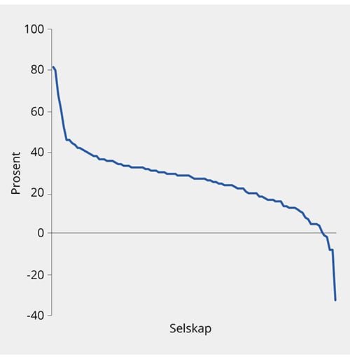 Avsnittene over viser at det har vært høy lønnsomhet på aggregert nivå i havbruksnæringen. Det er også mulig å studere forskjeller i lønnsomhet mellom selskapene ved å benytte data fra næringsoppgaven. Figur 6.3 viser ordinært driftsresultat før skattekostnad og netto finanskostnader for selskaper i havbruksnæringen sett i forhold til selskapets totalkapital for regnskapsåret 2017. Dette gir da et uttrykk for avkastning på totalkapitalen for ulike selskaper i havbruksnæringen. Figur 6.3 viser at de aller fleste havbruksselskapene har positiv avkastning på kapitalen og mange selskaper har svært høy avkastning. De fleste selskapene har en avkastning som ligger på mellom 10 og 40 pst.