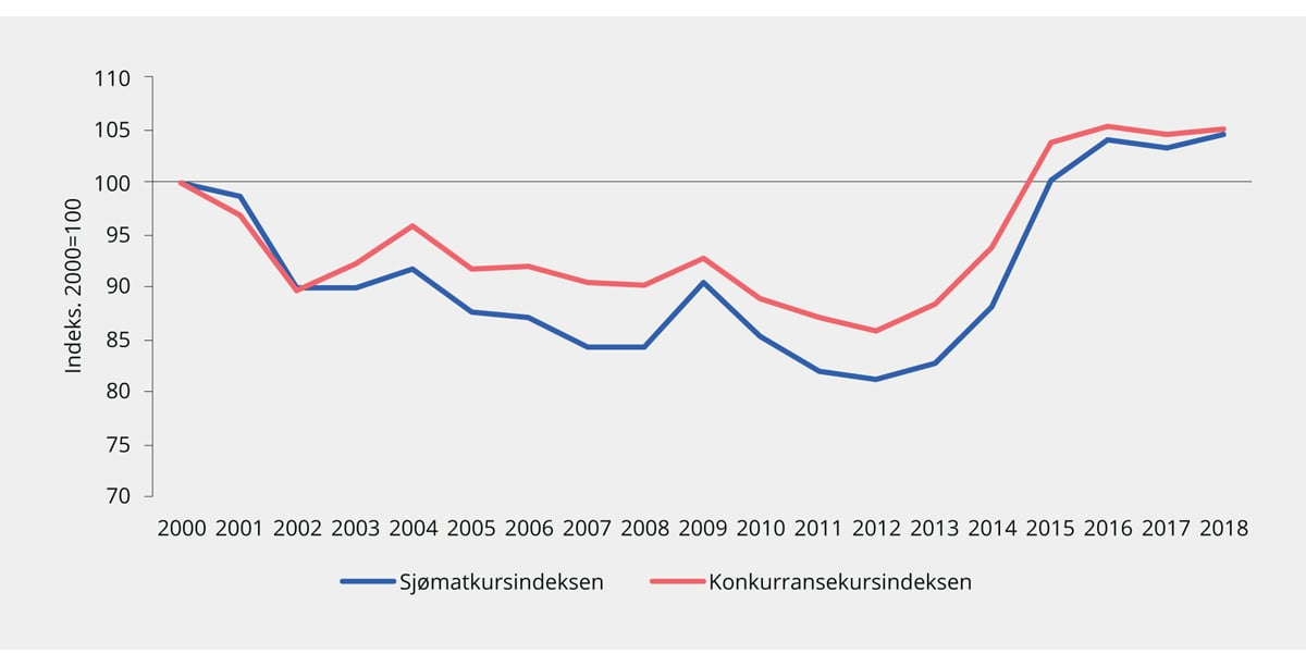 Ifølge Nyrud et al. (2016) har sjømatnæringen stått overfor større svingninger i valutakursene enn øvrig norsk eksportindustri når en sammenligner variansen i sjømatkursindeksen og konkurransekursindeksen. Dette skyldes imidlertid at konkurransekursindeksen er satt sammen av en bredere portefølje av valutaer, og viser kun at sjømatnæringen er mer eksponert for valutasvingninger enn industrien sett under ett. Enkeltnæringer innen industrien vil imidlertid kunne være eksponert for valutasvingninger i større eller like stor grad som sjømatnæringen. Figur 6.5 viser utviklingen i de to valutakursindeksene i perioden 2000 til 2018. Tallene for sjømatkursindeksen er hentet fra Nyrud (2018), samt tall som utvalget har mottatt fra Nofima.