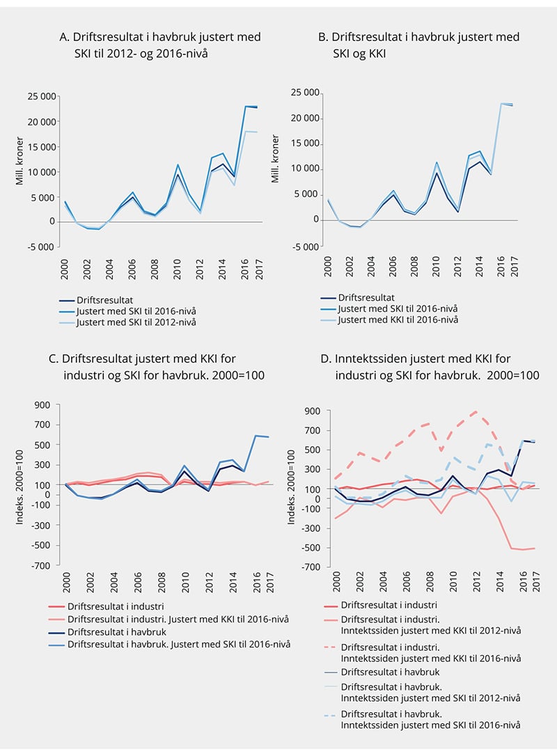 Når driftsresultatet justeres med en valutakursindeks, forutsettes det implisitt at inntektssiden og kostnadssiden er like utsatt for svingninger i valutakursen. Felles for havbruksnæringen og deler av eksportindustrien er at det særlig er inntektssiden som er eksponert for valutakursendringer idet en vesentlig andel av kostnadene knytter seg til innkjøp og sysselsetting i Norge. I figur 6.6 D er kun inntektssiden, målt ved produksjonen i basisverdi fra nasjonalregnskapet, justert med sjømatkursindeksen for havbruksnæringen og med konkurransekursindeksen for industrien. Denne analysen indikerer at valutakursen har noe større betydning for variasjonen i lønnsomhet enn i de forrige figurene, og særlig de siste årene. Virkningen er imidlertid større for industrien enn for havbruksnæringen.