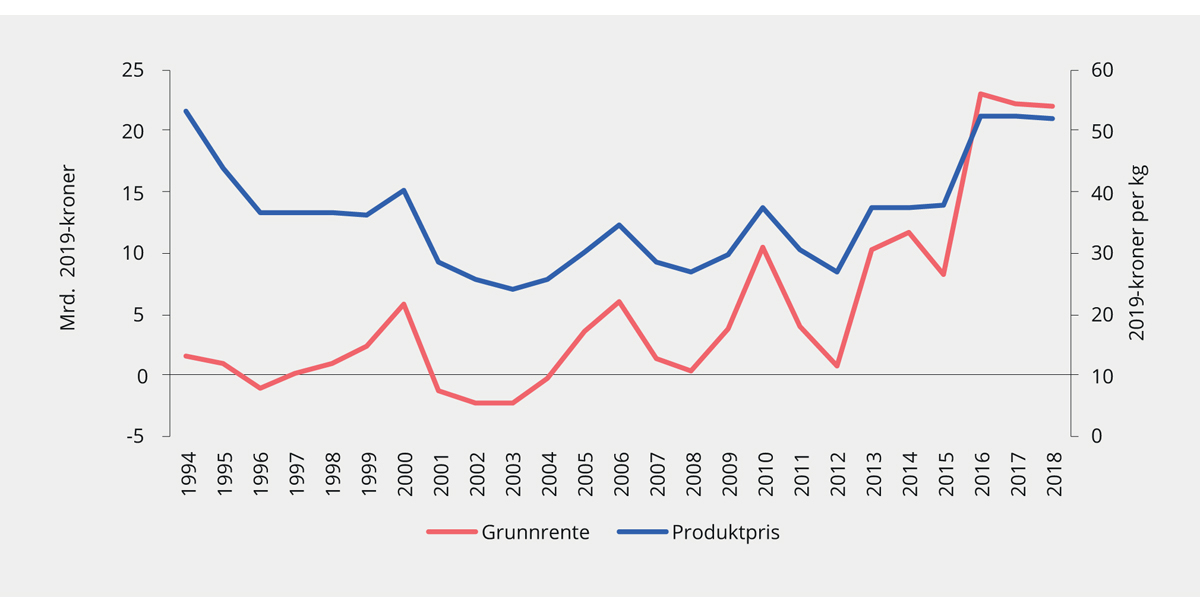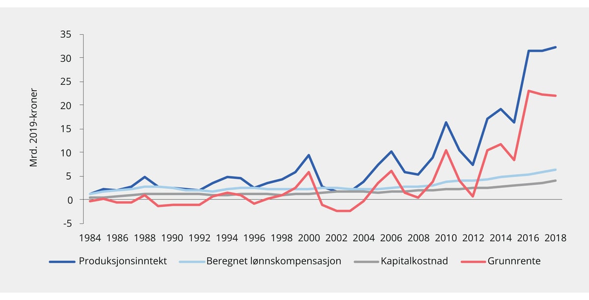 Analysen fra Greaker og Lindholt viser at frem til 2000-tallet var ikke grunnrenten spesielt høy, og i enkelte år negativ. I en periode fra 2000 til 2012 viste grunnrenten en stigende trend, men svingte kraftig fra år til år. Grunnrenten i havbruk har steget markant fra 2012, og i perioden 2016 til 2018 har den vært på i overkant av 20 mrd. kroner årlig. Flåten og Pham anslår grunnrenten i selskapene som inngår i Fiskeridirektoratets lønnsomhetsundersøkelse til om lag 19 mrd. 2019-kroner i 2016. Dersom anslaget skaleres opp til å omfatte alle havbruksselskaper, kan grunnrenten anslås til om lag 27 mrd. 2019-kroner i 2016. Utvalgets anslag basert på skattedata viser at grunnrenten har variert fra om lag 10 til om lag 23 mrd. 2019-kroner i perioden 2013 til 2017.